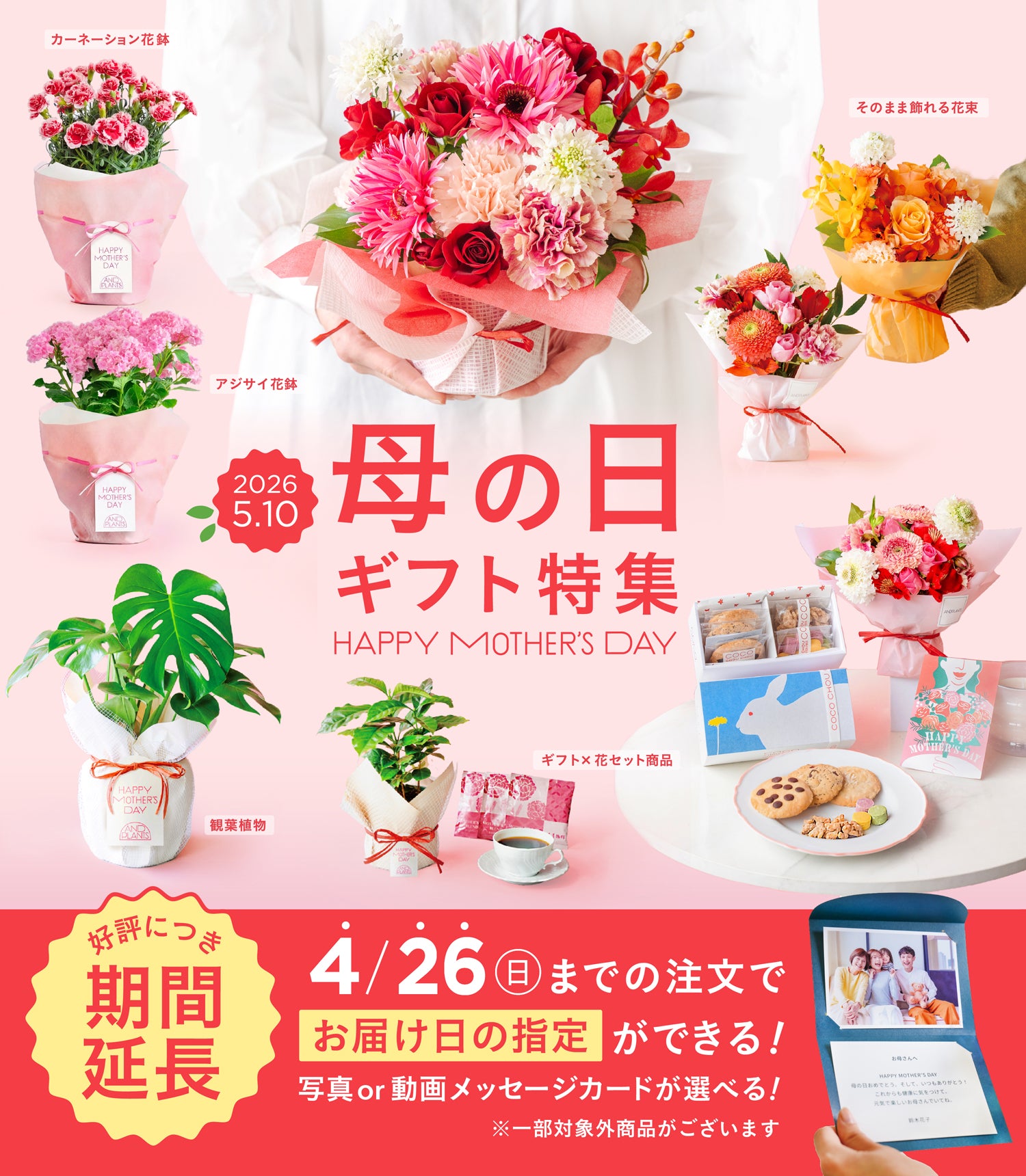 またメッセージカードも無料で追加が可能です。90文字以内でご自由にメッセージを入力でき、素敵なカードに印刷して同梱いたします。