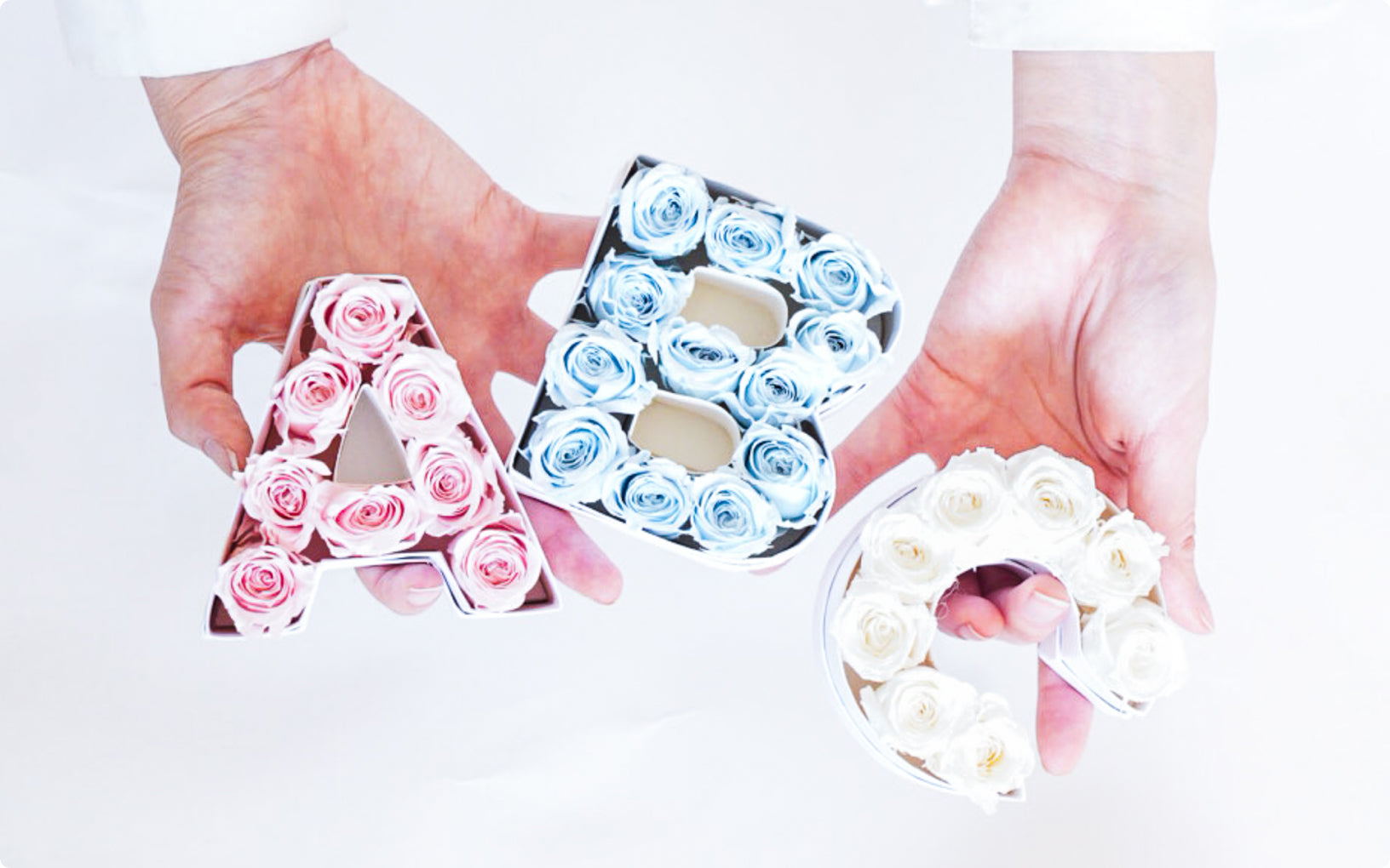 プリザーブドのバラで形作られたアルファベットオブジェ。A〜Z全てと、&の文字を揃えております。