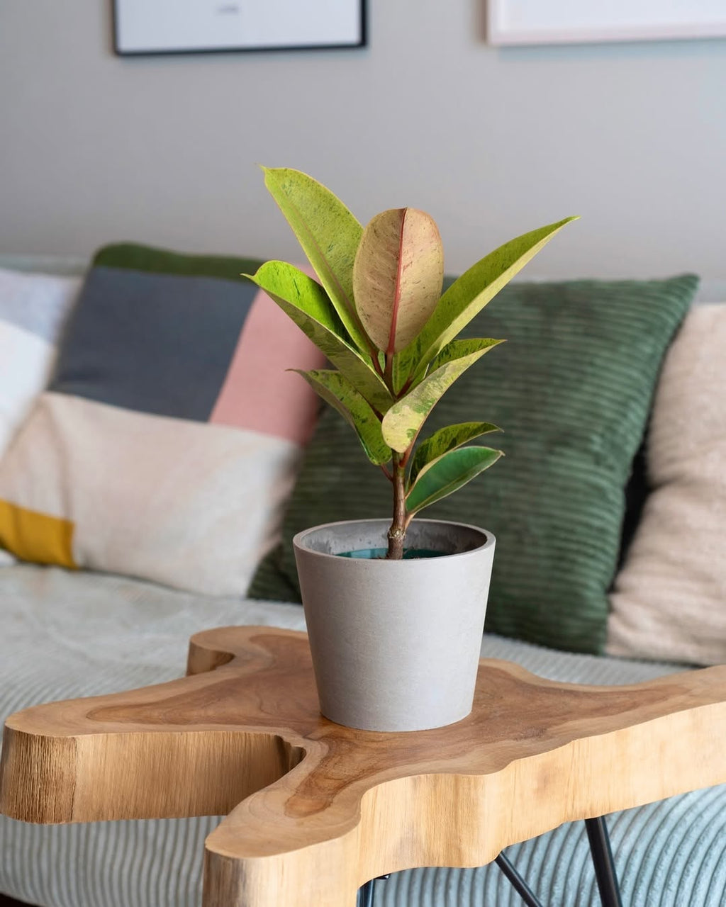 フィカス・ジンは、かすんだ散り斑が入った美しい葉をもつ観葉植物。ゴムの木の仲間ですが、流量が少ないため希少です。新芽は赤ピンクのような色で、次第に白から緑へと葉が変化します。鑑賞価値が高いので、コレクションとして飾るのもありです。