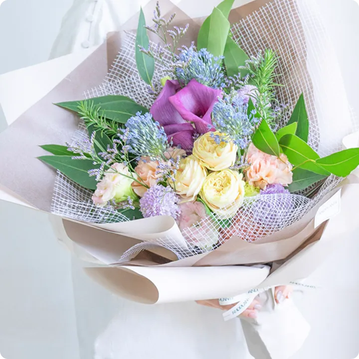 ご希望の花材に加えて、旬のお花や珍しい品種の花材を厳選して作成いたします。他では見ないとっておきの花材と組み合わせて洗練されたブーケやアレンジをお届けします。