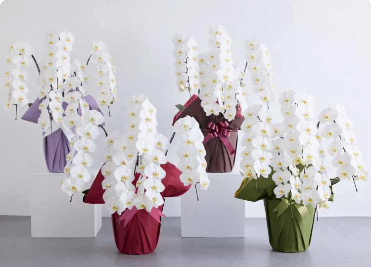 上品さと華やかさを兼ね備えた、ギフトに定番の胡蝶蘭。花持ちが良いため、長く店頭を彩ることができます。立て札を付けることで「贈り主」をアピールでき、フォーマルなシーンに最適です。