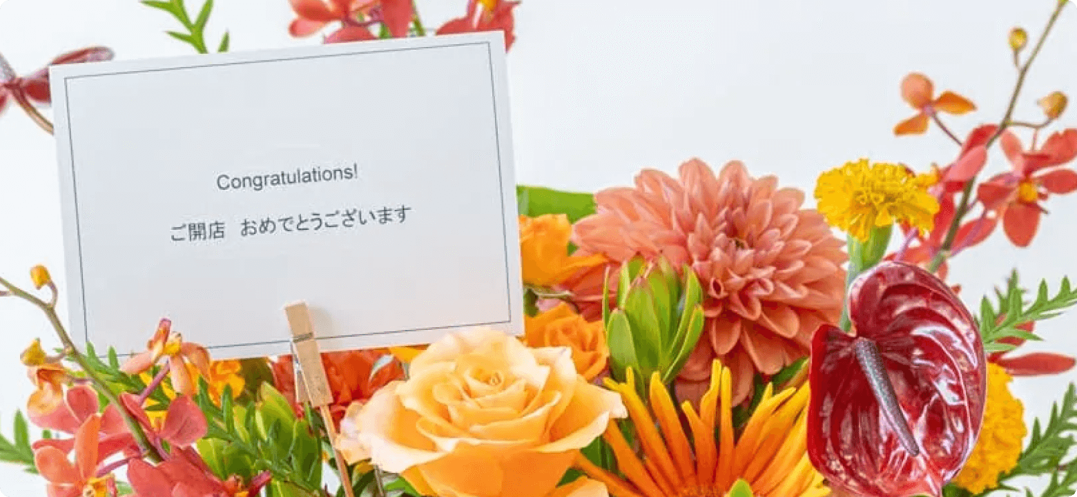 御開店」「御開店おめでとうございます」などの言葉を添えて、送り主の名前を入れてください。宛名の漢字・ローマ字などの綴りは、間違いがないように、事前に確認してから準備しましょう。