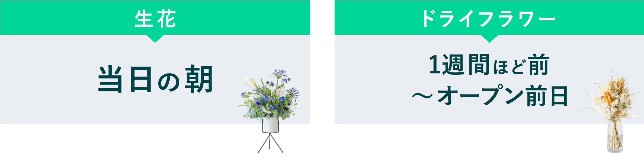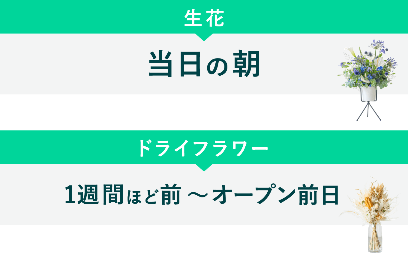 生花は、開店・開業当日の朝に届けるのが一般的です。ドライフラワーは、1週間ほど前に送っても大丈夫です。開店日に届けてもよいですが、当日は忙しい可能性もあるため、オープン前に届けるのをおすすめします。お客さんがいない方が、お店側としても対応しやすいでしょう。