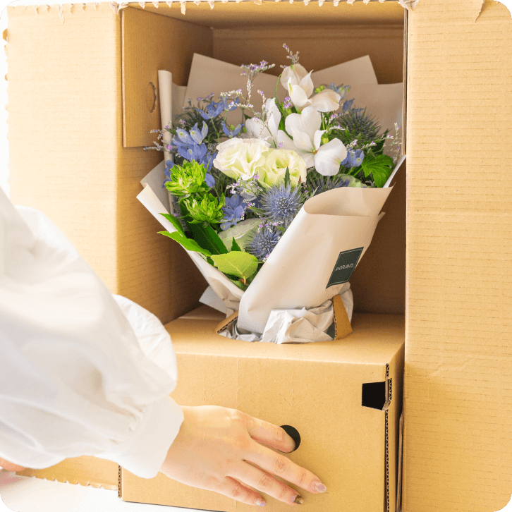 特化したオリジナルの梱包デリケートな花束の輸送に特化した独自のダンボールを開発。 丈夫な梱包で大切な花束を優しく守り、丁寧にお届けします。