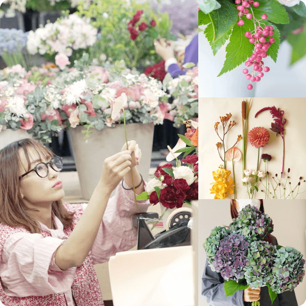 フローリストこだわりの、普段はあまり見ないような珍しい品種・色味の花材を使用しています。
