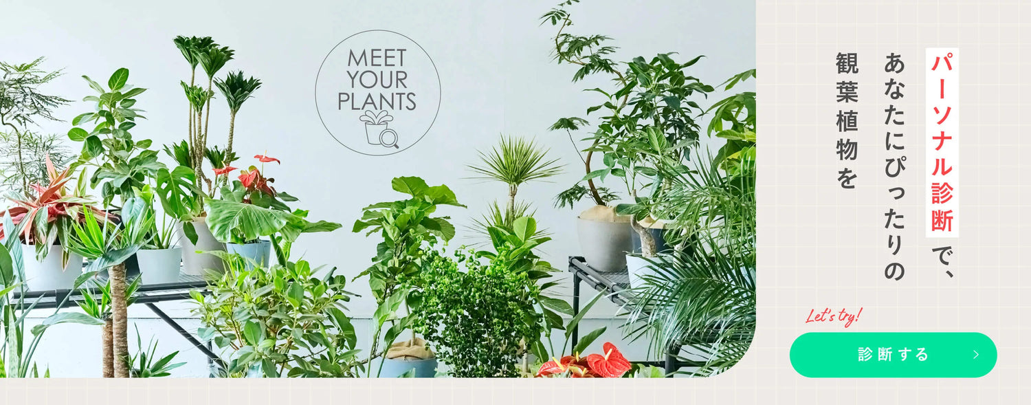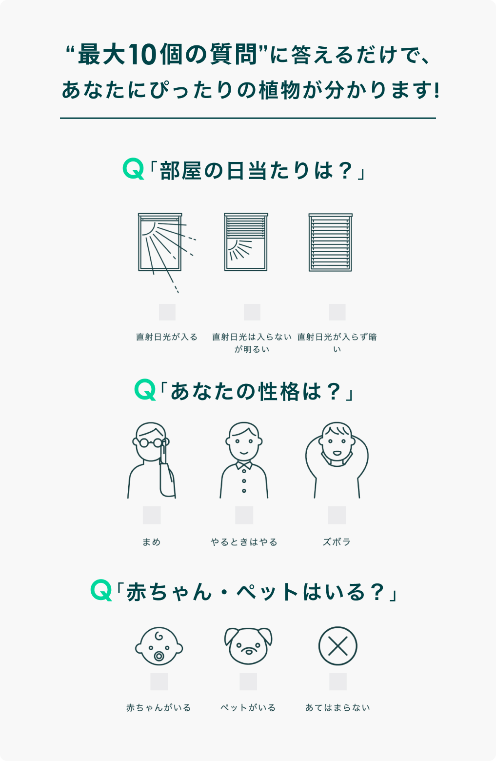 最大10個の質問に答えるだけで、140種類・640パターン以上の商品の中から、 あなたにぴったりの植物をお選びします。