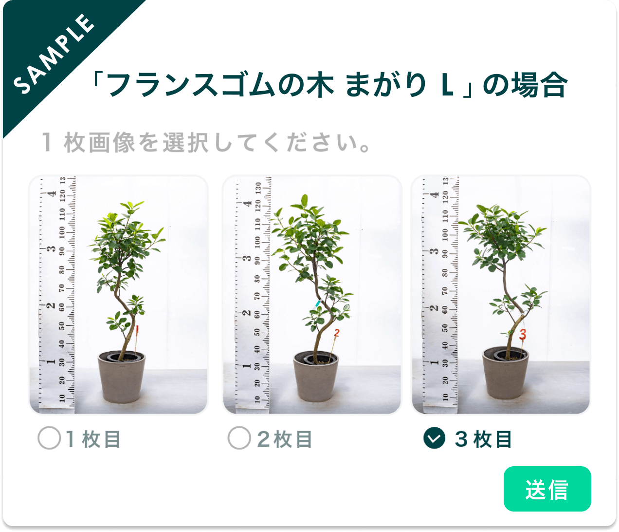 樹形にこだわりたい方は、樹形選択サービス(有料)をご利用いただければ、購入いただいた植物の3つ候補をお送りしますので、その中からお好きな個体をお選びいただけます。(XLサイズは2つの候補です。)