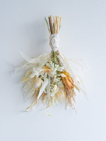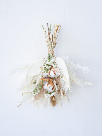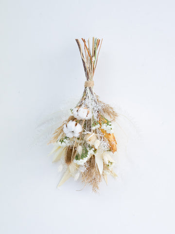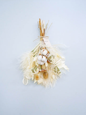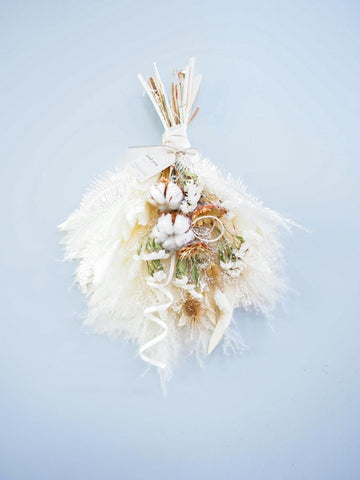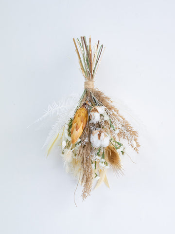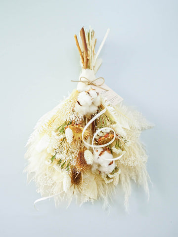ドライフラワーのスワッグは、壁やドアを華やかに彩る壁掛け花束です。花瓶に飾れる花束とは違い、比較的背中が平らな印象になります。画鋲やフックに引っ掛けることが出来るように、輪っかがついています。天然の色味が作りだす優美な風景をお届けします。 白ベージュ系の色味は、手に取っていただいた時のままほとんど退色がございません。お部屋のインテリアにも馴染みやすく、長くお楽しみいただけます。