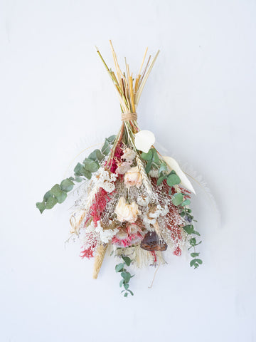 ドライフラワーのスワッグは、壁やドアを華やかに彩る壁掛け花束です。花瓶に飾れる花束とは違い、比較的背中が平らな印象になります。画鋲やフックに引っ掛けることが出来るように、輪っかがついています。天然の色味が作りだす優美な風景をお届けします。 ピンクの色味はくすんだ風合いで愛らしく、優しい雰囲気を纏わせ仕上げました。お部屋を上品に飾ります。