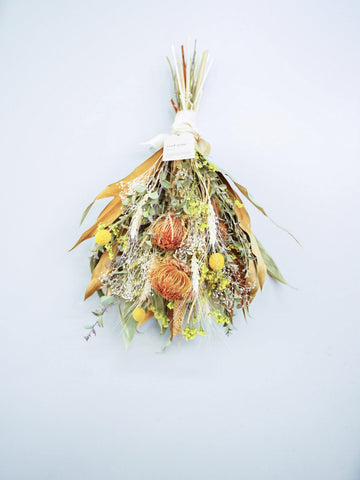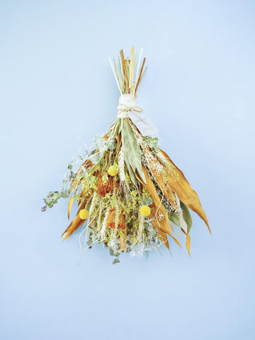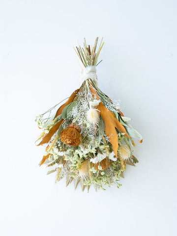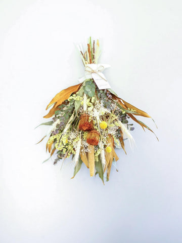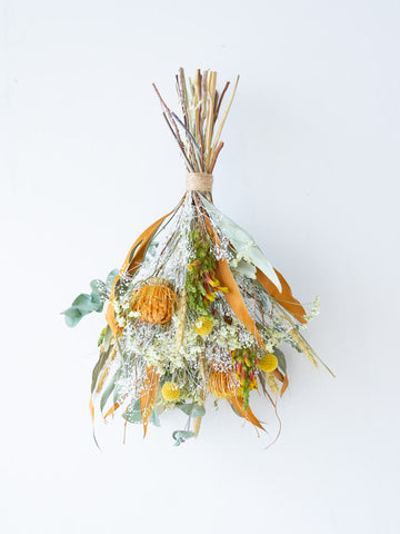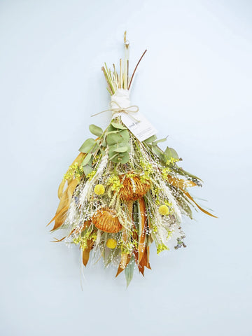 ドライフラワーのスワッグは、壁やドアを華やかに彩る壁掛け花束です。花瓶に飾れる花束とは違い、比較的背中が平らな印象になります。画鋲やフックに引っ掛けることが出来るように、輪っかがついています。天然の色味が作りだす優美な風景をお届けします。 黄色系は他の色味と違い、ワイルドフラワーをふんだんに使ったアースカラーのデザインに仕上げました。お部屋を個性的に飾ります。