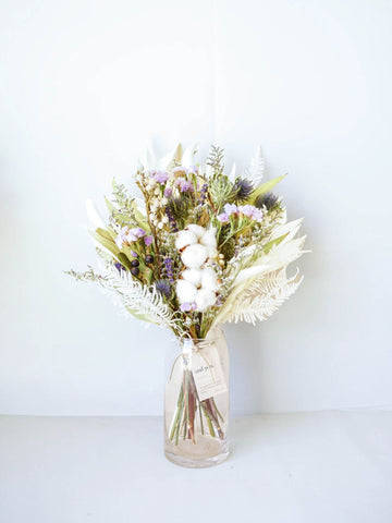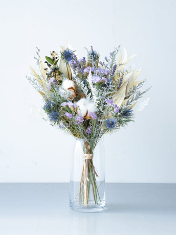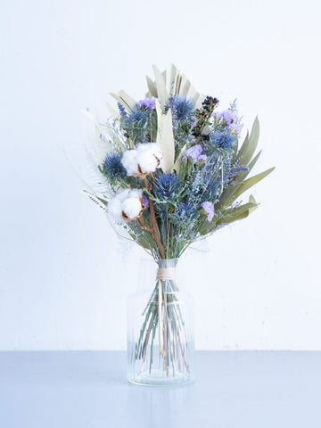 ドライフラワーの花束で食卓やキャビネットを華やかに演出しませんか?AND PLANTSおすすめの花瓶とセットで購入できるほか、ご自宅にある花瓶に入れていただくこともできます。天然の色味が作りだす繊細な美しさをお届けします。 青系の色味は自然の色のもののみを集めた、鮮やかなドライブーケです。お部屋をスタイリッシュに飾ります。