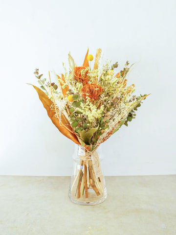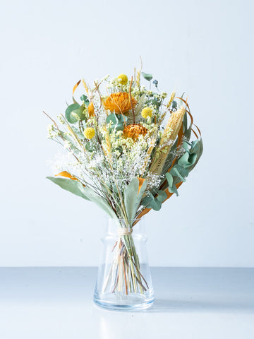 ドライフラワーの花束で食卓やキャビネットを華やかに演出しませんか?アンドプランツおすすめの花瓶とセットで購入できるほか、ご自宅にある花瓶に入れていただくこともできます。天然の色味が作りだす繊細な美しさをお届けします。 黄色系は他の色味と違い、ワイルドフラワーをふんだんに使ったアースカラーのデザインに仕上げました。お部屋を個性的に飾ります。