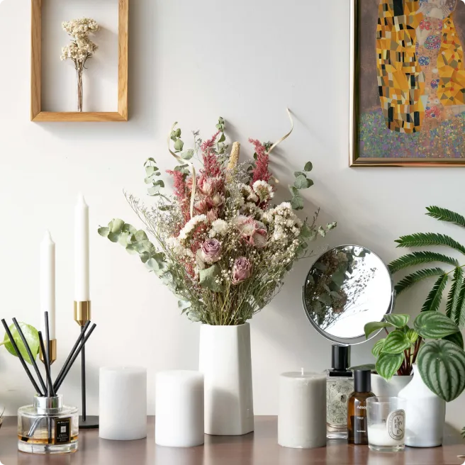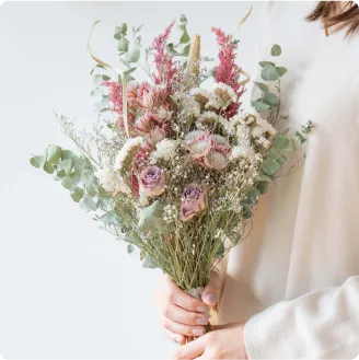 A 明確にドライフラワーの寿命は決められていませんが、一般的には半年から1年ほどが「美しい状態を保てる期間」と言われています。時間が経つにつれ、色あせてきたり、花びらや葉がもろくなってまいりますが、その変化もお楽しみいただけます。