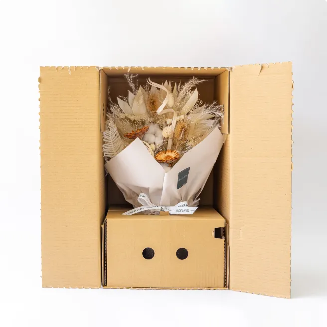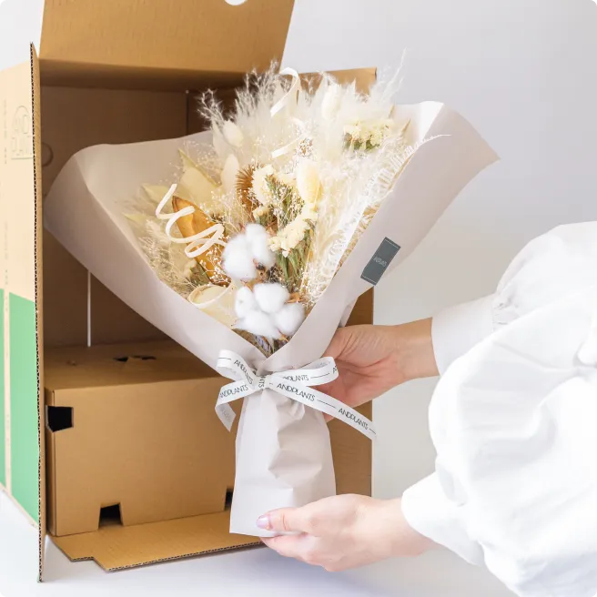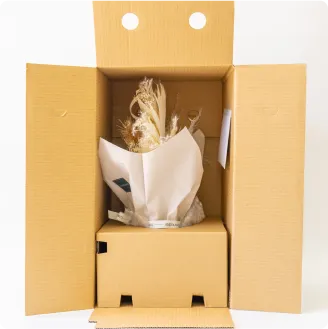 デリケートなお花の輸送に特化した独自のダンボールを開発。大切なブーケをしっかりと守り、丁寧にお届けします。