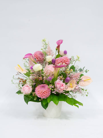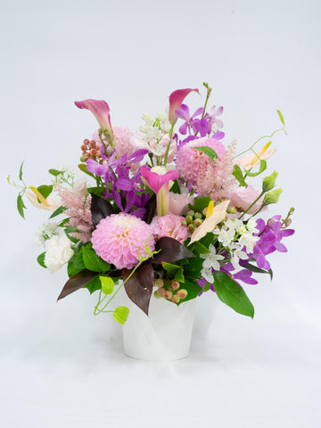 父の一周忌のお供えにお花を贈りたくて初めて注文させていただきました。今の時期には珍しい大きなピンク色のダリアや美しい薔薇が入った華やかで美しいアレンジに母がとても喜び感動していました。お花の状態がとても素晴らしいと思います。