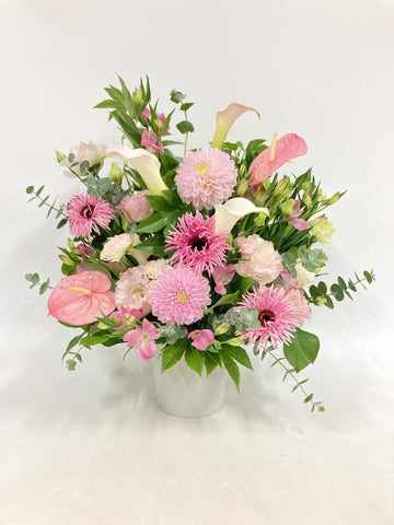 季節に合わせた旬のお花をメイン花材とし、そのお花に合った色味の花材やフレッシュな葉物を組み合わせてご提案します。器が付いた状態ですので、届いてすぐに飾って楽しんでいただけます。