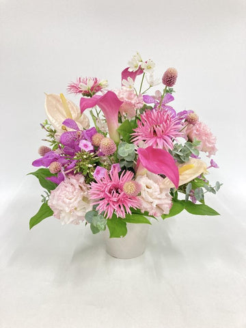 季節に合わせた旬のお花をメイン花材とし、そのお花に合った色味の花材やフレッシュな葉物を組み合わせてご提案します。器が付いた状態ですので、届いてすぐに飾って楽しんでいただけます。