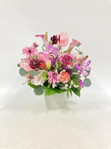 イベント開催のお祝いにと、こちらのアレンジメントを贈らせていただきました。おしゃれで可愛くアレンジされていて大満足でした!Мサイズでお願いしたのですが、大き過ぎずでも存在感はしっかりあってちょうど良い大きさでした。素敵な贈り物ができました!自分用にも欲しくなってしまいました。この度はありがとうございました!!
