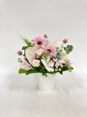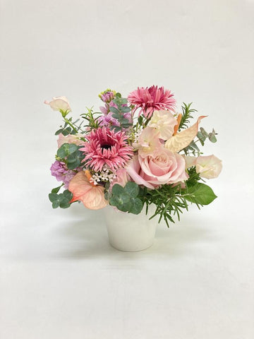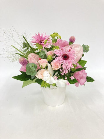 季節に合わせた旬のお花をメイン花材とし、そのお花に合った色味の花材やフレッシュな葉物を組み合わせてご提案します。器が付いた状態ですので、届いてすぐに飾って楽しんでいただけます。