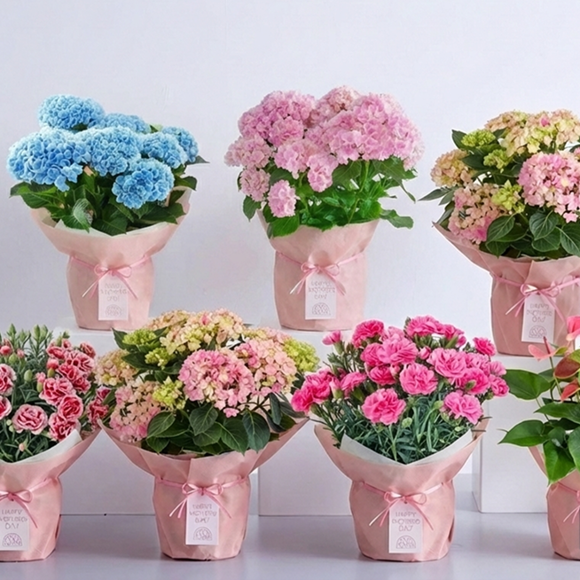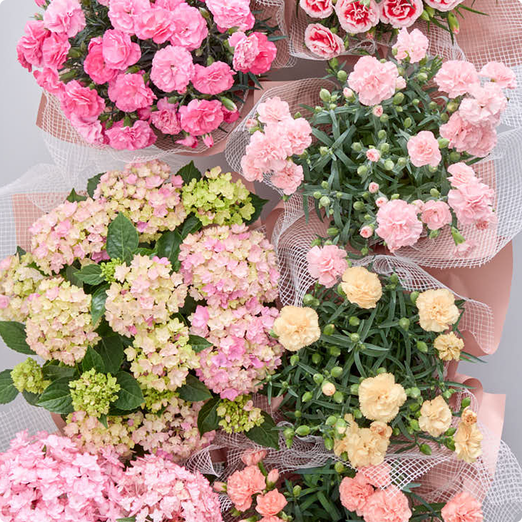 華やかで愛らしいカラーのカーネーションやアジサイの花鉢を揃えました。花びらと覆輪のコントラストが美しいカーネーションや淡い小花がかわいらしいアジサイは母の日の贈り物に最適です。