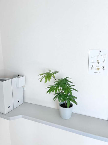 春から夏にかけては、淡い黄緑色のふわふわとした花を咲かせ、まれに赤いサヤをつけることも。夜になると自然に葉を閉じて休む「睡眠運動」を行う姿も愛らしく、和名「アカサヤネムノキ」の由来にもなっています。