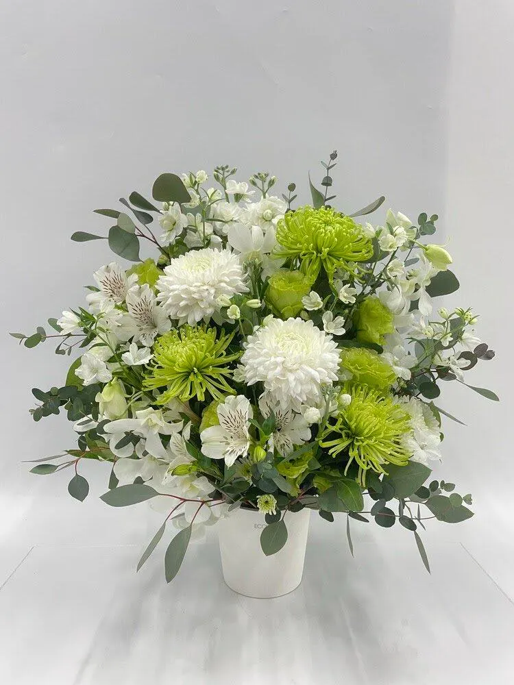 商品写真が多く購入前の検討に役立ちました。実際の商品も綺麗に仕上げていただきありがとうございました。四十九日の供花用に購入しましたが、白く清らかなお花に明るいグリーンが映えた綺麗なアレンジメントでした。ありがとうございます。