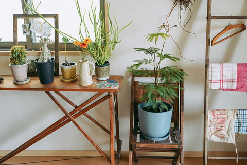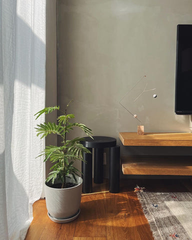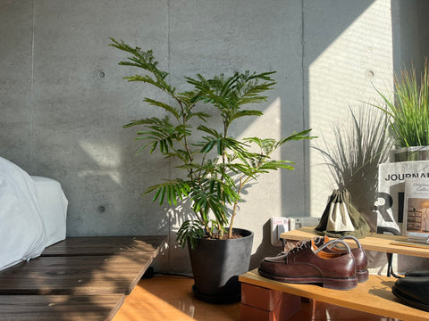 床にそのまま置くのはもちろん、スツールや低めの台に乗せて高さを出すのもおすすめです。圧迫感を与えないサイズ感で、リビングのチェスト横や寝室の一角など、ライフスタイルに合わせて自由に楽しめます。成長に合わせて置き場所を変えたり、高低差をつけて他の植物と組み合わせたりと、インテリアの幅が広がる一鉢です。