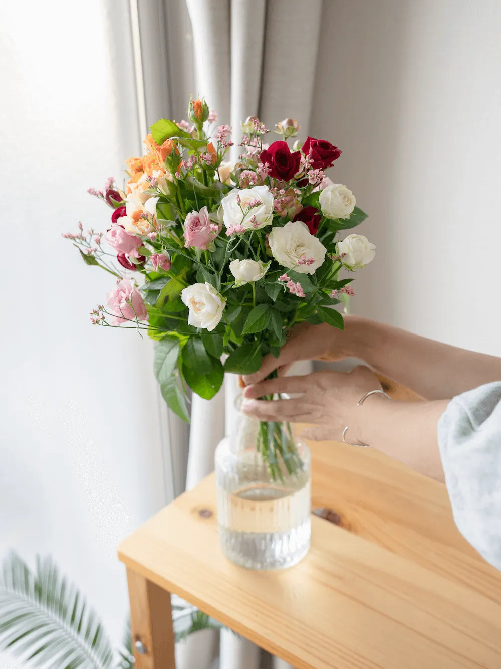 付属の「生花の取り扱いについて」を参考に花瓶にお入れください