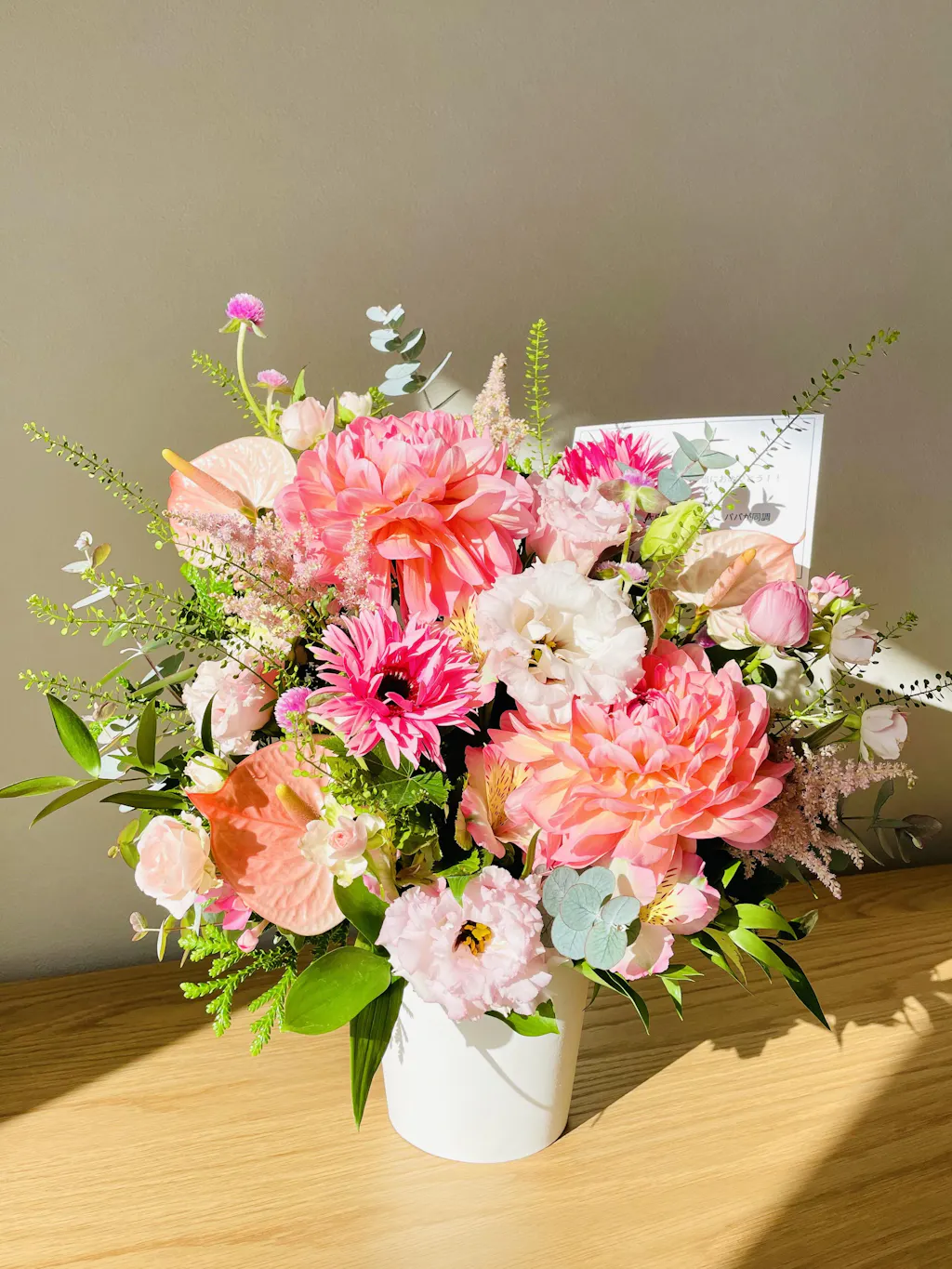 季節に合わせた旬のお花をメイン花材とし、そのお花に合った色味の花材やフレッシュな葉物を組み合わせてご提案します。器が付いた状態ですので、届いてすぐに飾って楽しんでいただけます。